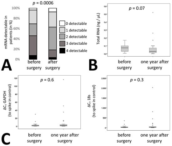In addition to membrane proteins, the cargo of these vesicles can also be used to identify the origin of extracellular vesicles. We therefore measured the signature of liver specific mRNAs in RNA isolated from the pellet of the extracellular vesicle fraction of patients’ plasma after centrifugation as indicated in Materials and Methods. Circulating extracellular vesicle mRNA signature of four hepatic proteins, namely straight-chain-acyl-coenzyme-A-oxidase-1 (ACOX), acyl-coenzyme-A-dehydrogenase (ACADM), long-chain-L3-hydroxyacylcoenzyme-A-dehydrogenase (HADH) and 3-hydroxybutyrate-dehydrogenase (BDH) were influenced by bariatric surgery. Whereas 46% of patients had all four or three of four mRNAs detectable in circulatory extracellular vesicles before surgery only 18% of patients were tested positive for four or three mRNAs after surgery (Figure 3A, p = 0.0006). Overall, there was no change in extracellular vesicle-circulating mRNA amounts before and one year after bariatric surgery as confirmed by measurement of total RNA in all patient samples (Figure 3B). In addition, two housekeeping genes, namely 18s RNA and glyceraldehyde-3-phosphate-dehydrogenase (GAPDH) were readily detectable in the extracellular vesicle fraction of all samples and remained at similar levels when adjusting to an input control (Figure 3C).