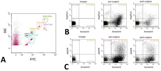 Representative flow cytometry dot plots. Dot plots for bead-based size estimation showing a bead mix labeled with FITC and an unlabeled fraction (A). The various gates are labeled with the size of the measured beads, percentages represent the relative number of beads measured compared to the whole sample. Dot plots are further shown for Annexin V and HepPar1 (B) and ASGPR and Annexin V (C). All examples are given before and after surgery. A representative isotype control picture is included in the panel. Gating was performed according to the values obtained in the histograms, percentages display the relative amount of events in comparison to the total event number.