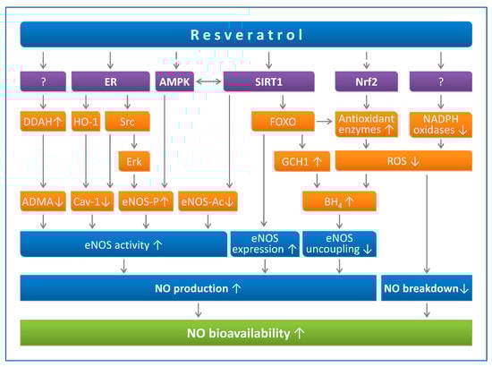 Resveratrol increases endothelial NO production through multiple mechanisms (Figure 1), including upregulation of eNOS expression, enhancement of eNOS enzymatic activity, and prevention of eNOS uncoupling [].