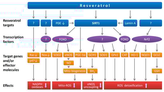 Since the capacity of resveratrol to directly eliminate free radicals is lower than that of already established antioxidant reagents, the means by which it diminishes oxidative stress in vivo are more likely due to its ability to regulate gene expression (Figure 2) []. Indeed, resveratrol is a potent gene regulator []. At a concentration of 0.1 µM, resveratrol has been shown to upregulate 127 genes and downregulate 233 genes in cultured human umbilical vein endothelial cells (HUVEC) [].