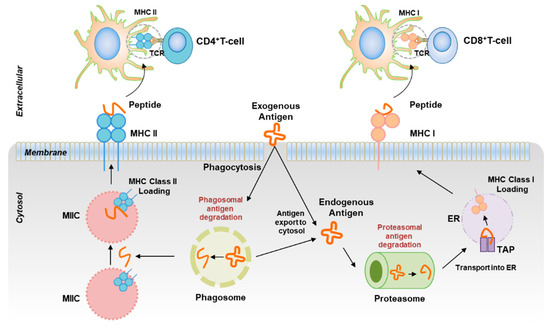 Schematic diagram for the cross-presentation machinery of DCs. DCs take up extracellular antigen, process it to antigenic peptides, and present these peptides not only with MHC II through the MIIC to CD4+ T cells (left), but also with MHC I through proteasome and the TAP/ER pathway to CD8+ T cells (right).