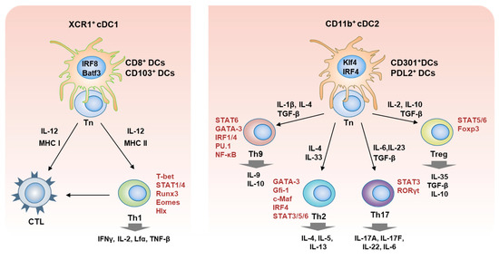 Schematic diagram for the involvement of cDC1 and cDC2 subsets in the T cell development. The XCR1+ cDC1, having major transcription factors, IRF8 and Batf3, are involved in the differentiation of naïve T cells into cytotoxic T lymphocytes (CTL) and Th1 cells with the cDC1 cytokine, IL-12 (left). Whereas, CD11b+ cDC2 known by their IRF4 and Klf4 facilitate the T cell development into Th2, Th9, Th17, and Treg cells with cDC2 cytokines (right). Key transcription factors mediating the development of each T cell subset are indicated in red. Each T cell subset secretes the effector cytokines as described.