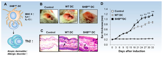 SHB-depleted DCs induce severe symptoms of AD in mice. (A) SHBKO DCs show typical cDC2 phenotypes, which induce Th2 inflammatory disorders. (B) In the mouse AD model, the mice subcutaneously injected with antigen-primed SHB-depleted DCs showed severe AD symptoms as compared with the control mice injected with SHB-normal DCs. (C) Histopathological analysis of AD after inoculation with normal and SHBKO DCs. Arrow indicates the infiltrated immune cells. (D) Graphical representation of ear thickness in mice after inoculation with normal and SHBKO DCs. Figure source Ahmed et al. (2017) [15].