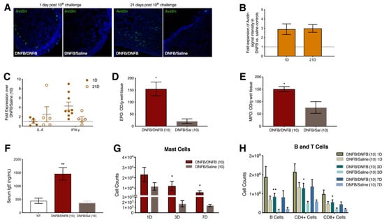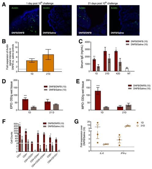 To demonstrate that allergic tissue changes occur in response to DNFB dissolved in saline instead of a more typical, harsher vehicle such as acetone, we measured mast cell and T cell infiltration as well as changes in inflammatory cytokines in the allergic skin of previously sensitized ND4 female mice after 10 DNFB challenges. Labiar mast cell density increased in flank-sensitized mice challenged with 10 daily topical DNFB administrations to the labiar skin compared to mice challenged with saline; there was a four-fold increase one day after the completion of challenges, and a seven-fold increase at 21 days (Figure 1A,B). Interestingly, serum IgE levels were significantly elevated compared to controls challenged only with saline 1 day after 10 DNFB challenges and remained so 42 days after challenges were completed (Figure 1C). Tissue eosinophil peroxidase and tissue myeloperoxidase levels increased sharply in DNFB-challenged mice vs. saline-treated controls one day after 10 challenges and resolved to levels indistinguishable from controls by 21 days after challenge cessation (Figure 1D,E). One day after the 10th DNFB administration, flow cytometric analysis of dissociated flank skin revealed a significant accumulation of CD3+, CD4+, activated CD4+CD44+, CD8+, and resident memory CD8+CD103+ in hapten-challenged but not in control mice (Figure 1F). mRNA transcripts encoding IL-6 and IFN-γ were upregulated 8 and 3-fold respectively in DNFB- vs. saline-challenged mice 1 day post challenge cessation. IL-6 mRNAs remained slightly upregulated over controls at 21 days after 10 DNFB challenges (Figure 1G). IFN-γ, which has been shown to drive mast cell-mediated immune responses [], was increased to 15-fold in DNFB- vs. saline-treated mice 21 days after 10 labiar challenges. All visually detectable signs of irritation (slight redness) resolved within 2 days of cessation of DNFB challenges. Since the inflammatory effects of DNFB in more typical organic solvent vehicles have, historically, been characterized mostly in inbred mouse strains, we verified that outbred ND4 female mice sensitized on the flank and subsequently challenged on the labiar skin with DNFB dissolved in acetone showed increases in local mast cell abundance and abundances of transcripts encoding IL-6 and IFN-γ (Figure S1A–C). However, we noticed that the harsher acetone solvent caused more dryness of the labiar skin compared to the saline vehicle we used for these studies.