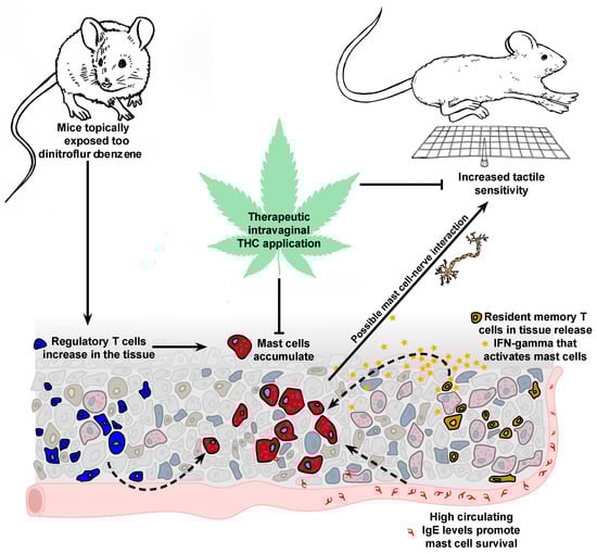 Repeated DNFB exposures on the skin lead to accumulation of regulatory T cells, resident memory T cells and mast cells. Mast cell increases are correlated with increased tactile sensitivity; therapeutic intra-vaginal THC application reduces mast cell density and tactile pain. Solid arrows indicate the hypothesized mechanisms proposed in this model. Dotted lines indicate previously published experimental observations of the contributions of regulatory T cells, IFN-γ and circulating IgE to mast cell recruitment, survival and activity in the tissue. T-bars indicate suppression of mast cell accumulation and tactile sensitivity following THC application. Artwork by Amy Pelz.