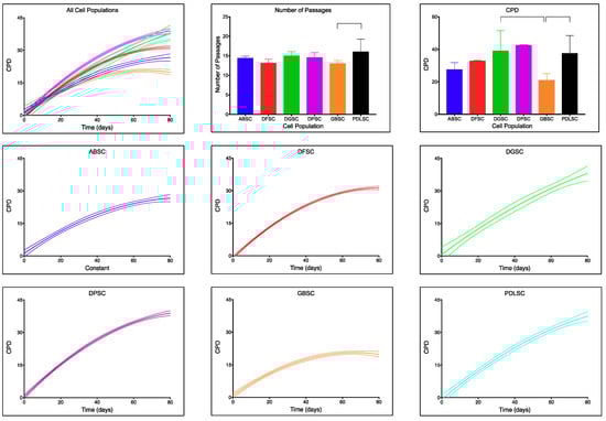 Each of the cell populations was maintained in culture for up to 80 days. They followed non-linear proliferative rates (Figure 1). Each population followed a different accumulated population duplication (CPD) curve (Table 1) and we were not able to design one curve to statistically fit all populations. In order from lower to higher proliferative potential, GBSC (20.85 ± 4.24), ABSC (27.50 ± 4.36), DFSC (32.86 ± 0.35), PDLSC (37.52 ± 10.94), DGSC (39.04 ± 12.48), and DPSC (42.45 ± 0.34). The final CPD was not statistically significant between the different populations except for the comparison between GBSC and DGSC (p = 0.005; Dunn’s multiple comparison test) and between GBSC and PDLSC (p = 0.001; Dunn’s multiple comparison test). In all cases, the number of passages was below 20 (GBSC [13.00 ± 0.85], DFSC [13.13 ± 0.99], ABSC [14.40 ± 0.52], DPSC [14.55 ± 1.29], DGSC [15.00 ± 1.10], and PDLSC [16.00 ± 3.27]). Similar to CPD, the number of passages necessary during those 80 days was not statistically significant between the different populations except for the comparison between GBSC and PDLSC (p = 0.027; Dunn’s multiple comparison test). Senescence was first detected in passages over 25.