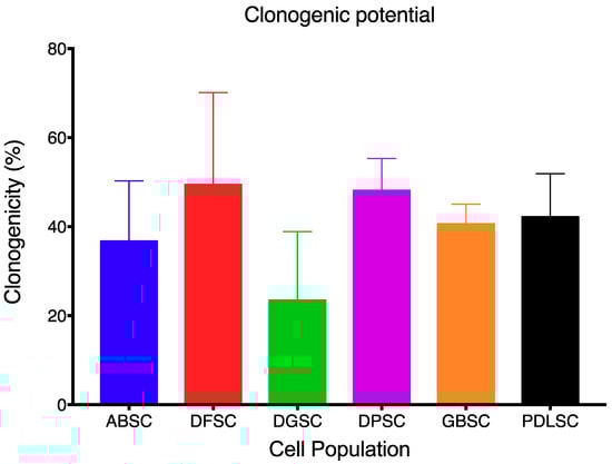 Each MSC population showed a different clonogenic potential, although comparisons were not statistically significant (p = 0.325; Kruskal–Wallis test). From lower to higher clonogenicity potential: DGSC (23.44 ± 15.47), ABSC (36.72 ± 13.59), GBSC (40.63 ± 4.42), PDLSC (42.19 ± 9.72), DPSC (48.13 ± 7.20), and DFSC (49.48 ± 20.64) (Figure 2).