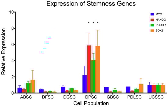 The expression of the stemness gene MYC in comparison with the previously established MSC from the umbilical cord (UCSSC) [9] (Figure 3) showed no statistical differences (p > 0.213; Dunnett’s multiple comparison test). In contrast, the expression of NANOG, POU5F1, and SOX2 were statistically higher in DPSC (p < 0.001; Dunnett’s multiple comparison test) compared to UCSSC, but lower in all of the other cell populations, although not significantly.