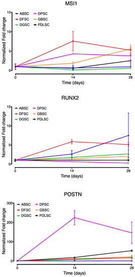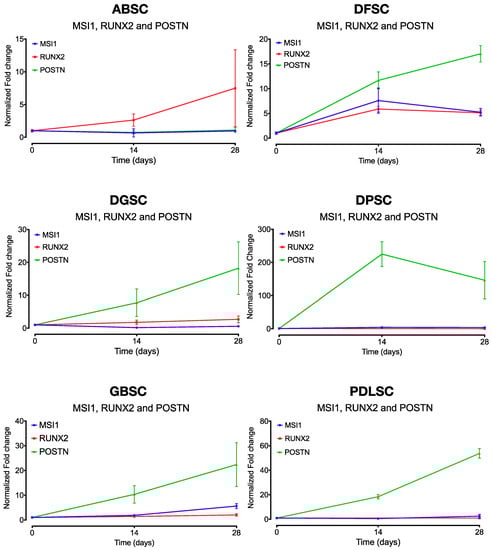 When comparing the relative gene expression of MSI1, RUNX2, and POSTN within each cell population, there was a statistically significant differential expression of MSI1 and RUNX2 only in ABSC (28 days; p = 0.024). In all other cell populations, MSI1 and RUNX2 followed a comparable pattern of expression under osteogenic differentiation conditions with no significant differences (Figure 8). In contrast, MSI1 and POSTN were statistically different in DFSC (14 and 28 days; p = 0.021 and p < 0.001, respectively), DGSC (28 days; p = 0.001), DPSC (14 and 28 days; p = 0.001 and p = 0.005, respectively), GBSC (28 days; p = 0.001), and PDLSC (14 and 28 days; p < 0.001 and p < 0.001, respectively). Similarly, POSTN and RUNX2 were statistically different in ABSC (28 days; p = 0.027), DFSC (14 and 28 days; p = 0.003 and p < 0.001, respectively), DGSC (28 days; p = 0.002), DPSC (28 days; p = 0.004), GBSC (28 days; p < 0.001), and PDLSC (28 days; p < 0.001). All p values above represent Tukey’s multiple comparisons test.