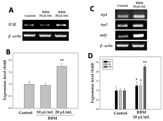 Results of mRNA expression analysis using reverse transcription-polymerase chain reaction in zebrafish (n = 15) after treatment with rice bran mineral extract (RBM) at 5 days post-fertilization (dpf). (A) mRNA expression of the pro-inflammatory cytokine IL1β; (B) Expression level of IL1β mRNA using β-actin as the reference gene; (C) mRNA expression of pigmentation-related genes; (D) Expression levels of trp1, trp2, and mitf using β-actin as the reference gene. * p < 0.05, ** p < 0.01, compared to control.