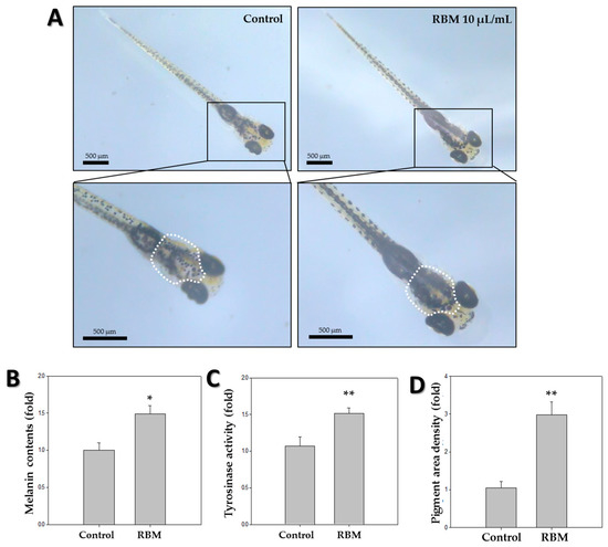 We first examined the inflammatory response of RBM by assessing the expression of inflammation-related cytokines. After treatment with 20 µL/mL RBM, zebrafish larvae showed high induction of the pro-inflammatory cytokine IL1β, whereas no significant inflammatory response was observed in zebrafish at a concentration of 10 µL/mL RBM (Figure 1A,B). Therefore, subsequent in vivo pigmentation studies were conducted at a concentration of 10 µL/mL. The pigmentation effect of RBM on zebrafish was observed under a stereomicroscope in 5 dpf larvae (Figure 2A), and pigmentation area density was normalized to that in the control larvae (Figure 2D). As shown in Figure 2, we found that exposure to RBM increased pigmentation even at a low dose in 5 dpf larvae, without observable toxicity.