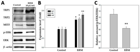 Expression of pigmentation-related proteins in 5 dpf zebrafish was measured using western blot analysis after treatment with 10 µL/mL RBM. As shown in Figure 3A,B, the expression of all pigmentation-related proteins, including tyrosinase-related protein 1 (TRP1), TRP2, and MITF increased by at least 1.5-fold compared to that in the control group. To assess the signaling pathways involved, we analyzed the phosphorylation of ERK (Figure 3A,C). In zebrafish treated with RBM, ERK phosphorylation was significantly decreased. Thus, western blotting analysis demonstrated that RBM treatment stimulated pigmentation in zebrafish.