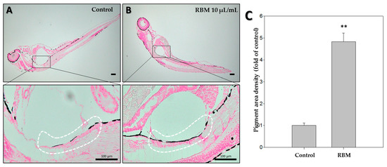 Next, we performed melanin content assays to assess melanin levels upon RBM treatment (Figure 2B). Melanin levels increased approximately 1.4-fold in zebrafish treated with RBM. To visualize melanin, we conducted Fontana-Masson staining (Figure 4A,B) and determined the pigmentation area density (Figure 4C). Compared with that in the control group, the extent of the pigmentation area was significantly increased in the RBM-treated group (black color). These in vivo results are consistent with our previous in vitro studies using RBM [10,11].