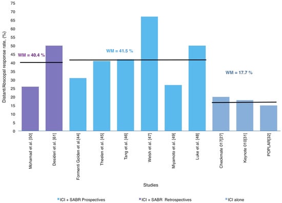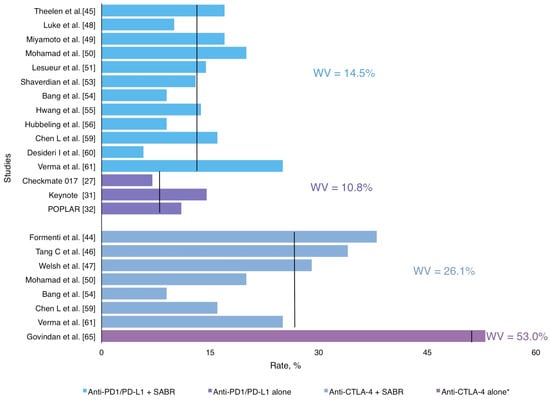 | Anti CTLA4 + SABR | 20.0 (2–38) | 26,0% | Pneumonitis, fatigue, liver enzymes increase, colitis and neurological |