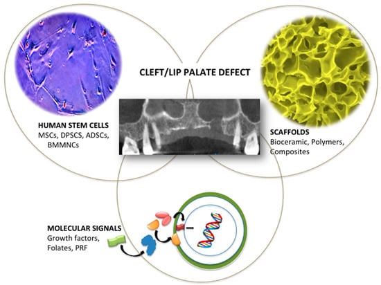 Craniofacial defects generally cause significant negative impacts on the quality of life and self-esteem of those individuals with musculoskeletal dysfunctionalities. Cleft lip, with or without cleft palate (CL/P), is the most prevalent congenital craniofacial defect caused by disturbed embryonic development of soft and hard tissues around the oral cavity and face area []. Current treatments for this orofacial condition generally demand early surgery and face reconstruction procedures that may be revised during childhood and infancy, causing a great number of patient complaints and economic burden to health systems that need to be minimized. Due to these reasons, alveolar cleft reconstruction has been considered one of the most controversial surgical procedures and less invasive therapies have being demanded since the beginning of the 20th century []. Fortunately, tissue engineering is rapidly providing successful regenerative therapies to several musculoskeletal conditions based on the synergic triad of using functional biomaterials, in conjunction with the vehiculization and local delivery of bioactive regenerative molecules and guided or recruited stem cells (Figure 1) that can modulate the etiopathogenesis of the disease and its prevalence by promoting the missing self-repairment mechanisms of affected tissues, thus improving the life conditions of affected patients. The functional reconstruction of highly vascularized bones, such as the craniofacial area, is a key challenge in bone tissue engineering, since it depends fundamentally on a well-organized hierarchical vascular network. The cell survival and viability, as well as the elimination of metabolic waste are in charge of the supply of oxygen and nutrients carried out by the blood vessels, in this way, the restoration of the neovasculature contributes to improve bone functionality []. Scaffold materials should allow vascular regeneration in a fundamental way as well as provide structure, osteonduction and osteoconduction characteristics when applied in the field of craniofacial regeneration []. Thus, accordantly with different authors, an ideal bone construction should combine a weightbearing rigid scaffold design, a porous structure that mimics the bone architecture, and cell-laden materials that favor new vascular formation []. The pore size and shape of a particular biomaterial play a key role in vascular ingrowth []. However, the size of the interconnections seems to be more important for the vascularization of a scaffold when compared with the pore size []. As such, fabrication designs, biocompatibility characteristics, porosity and matrix density are of critical consideration []. Despite the importance of this knowledge in the study of the craniofacial defect regeneration, there have been few studies on CL/P that deepen in assays on the neovascularization of tissues through the proposal of new materials. This review provides an updated and deep analysis of the studies that have reported on the use of advanced biomaterials and cell therapies for the regeneration of cleft lip and palate regeneration.