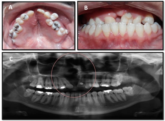 Image of a patient with unilateral cleft palate showing the different tissues involved (bone, dental organs, respiratory system and soft tissue) that need to be attended during the treatment and some malformation around the orofacial area responsible for causing respiratory and speech/language problems. Deformation of the arch and dental crowding (A), crossbite dental malposition (B), and the deviated nasal septum (C) as revealed by panoramic radiographs showing the maxillary defect (circle) (unpublished data).