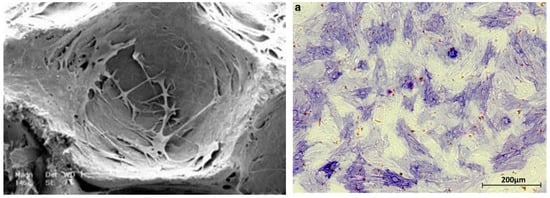 (Left) Scanning electron microscope views of the HA/TCP scaffolds Ceraform® seeded with Adipocyte stem cells (ADSCs) used for human maxillofacial reconstruction showing the ability of ADSC to adhere on the surface of and colonize the inner pores of the scaffolds. (Right) Alkaline phosphatase analysis of osteogenically differentiated BMSC cells after three days of cultivation on bovine hydroxyl apatite/collagen scaffolds. Reproduced from Pourebrahim et al. (2013) [] and Korn et al. (2017) [] with permission from Elsevier and Springer®, respectively.