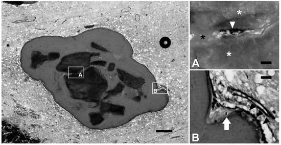 (Left) Induced bone formation by beta-TCP in the maxillary cleft of goats (A). Material (stars) is reabsorbed by a multinucleated osteoclast-like cell (arrowhead) (B). Elsewhere, cuboidal osteoblasts (black arrow heads) lay down new bone (pink) adjacent to an osteocyte (white arrow) in its lacuna. Reproduced from Janssen et al. (2017) [] with permission from SAGE Publications ®. Scale bars: 250 μm (left), 25 μm (right A, B).