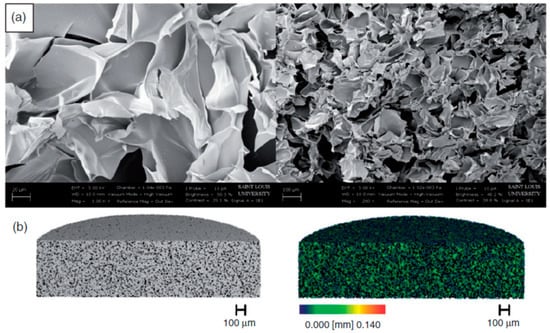 Analysis of a patient custom made patient cryogel. (a) SEM images taken at 1000 and 200X (left to right). (b) mCT 3D reconstruction images representing both the scaffold (grey) and the inner pores with the color bar denoting the size of the pores within the cryogel (left to right). Reproduced from Hixon et al. (2017) [] with permission from SAGE®.