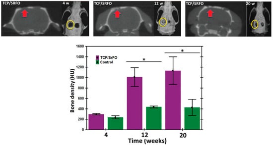 Micro-computed tomography images of cranial defects treated with TCP/SrFO scaffolds at 4, 12, and 20 weeks, and defect closure on the side of the implants form the coronal plane (arrows) and 3D images (circles) and bone density of the radiographic density (HU) in cranial defects. (* = Significant differences p < 0.001). Reproduced from [] with permission from the Royal society for Chemistry.