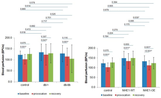Mean hind limb perfusion changes, expressed in BPUs (blood perfusion arbitrary units) registered in the diabetic (DB) group (left, 8 db/db and 8 db/+) and in the cardiac hypertrophy (CH) group (right, 8 NHE1-WT and 9 NHE1-OE) versus the Control group (n = 8), during the different phases of the experimental protocol. Statistical comparison, and respective p values between sub-groups is also shown (m ± sd: mean ± standard deviation; * p < 0.05).