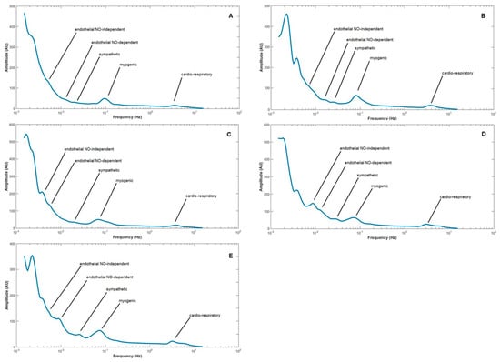 Mean power spectrum of the laser Doppler flowmetry (LDF) signal constructed for each group—Control (A, n = 8), db/+ (B, n = 8), db/db (C, n = 8), NHE1-WT (D, n = 8) and NHE1-OE (E, n = 9) from all perfusion mean values obtained during the complete protocol.