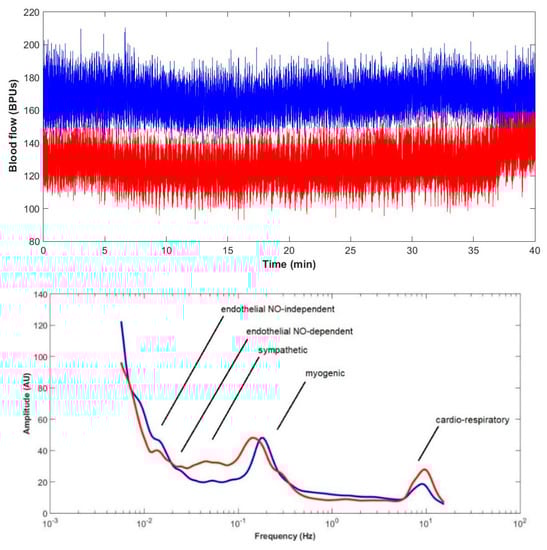 Laser Doppler perfusion imaging (LDPI) and flowmetry (LDF) are reference systems for these types of studies in human, as in animal models, but these involve some concerns, as both technologies rely on the same biophysical basis, producing the same signal of oscillatory nature, which is very difficult to analyze. Nevertheless, LDF has been used for decades, and also studied with the purpose to find ways to better understand its nature [7]. New mathematical modeling approaches of pulsatile signals, such as LDF, allowed researchers to define time variability, fractal organization, unpredictability, and chaotic profile, among other quantitative variables [8,9]. These modeling approaches have also provided the separation (decomposition) of its main components, meaning that those oscillations, with different time frequencies affecting the signal, can be related to the activity of different tissues or organs [7,10,11,12]. Human LDF components have previously been identified as cardiac, respiratory, myogenic (vascular wall), sympathetic, endothelial NO-dependent and endothelial NO-independent activities [11]. A fast Fourier transform (FFT) or the wavelet analysis (WA) [7,13,14] might easily provide this information, allowing a deeper look into the information included in the LDF raw signal. More sophisticated approaches have been proposed, such as the detrended fluctuation analysis (DFA) to assess its fractal organization and the multiscale entropy analysis (MSE) to observe signal complexity [13].