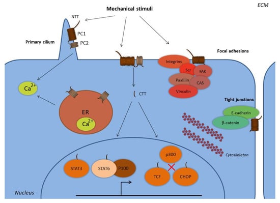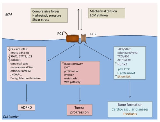 We now know that in a series of pathophysiologies such as atherosclerosis, cancer, osteoporosis, and deafness, as well as in several developmental disorders, the aberrant responses to applied or cell-generated mechanical cues contributes to the development and progression of the diseases []. This group of diseases shares common features of altered mechanotransducing signaling, and therefore it is crucial to identify the components of such complexes that mediate this process. In this context, polycystins are mechanosensing proteins that have been long ago attributed the role of being the causative agent of the autosomal polycystic kidney disease (ADPKD), where they have been extensively investigated. However, recent studies reveal the participation of these proteins in several clinical entities which have been associated with distorted mechanotransduction (Table 1). In this review, we critically discuss polycystin-mediated molecular mechanisms in certain diseases, based on recent data.
