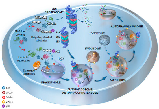 A schematic overview of the cell-clearing systems, with a focus on the interplay between autophagy and proteasome. The cartoon offers a rough schematization of the autophagy pathway, starting from the phagophore biogenesis staining for LC3 and Beclin1, which engulfs cytoplasmic portions containing insoluble aggregates, ubiquitinated substrates, and damaged organelles. The phagophore membrane seals to from the autophagosome, which then fuses with the late endosomes to generate the amphisome. This latter fuses with lysosomes to generate the autophagosome (staining for LC3, Beclin1, Rab24, VPS34, and p62) where cargo degradation occurs. At the same time, ubiquitinated substrates can be degraded by the 26S ubiquitin proteasome (UPS), which is formed by the regulatory subunits 19s and the catalytic subunits 20s. Signals such as p62 contribute to sort ubiquitinated proteins for either UPS or autophagy degradation. At the same time, p62 may serve as a signal to promote the merging of UPS and autophagy into a single organelle, “autophagoproteasome”, where potentiated cell-clearance may take place. Alternatively, the autophagy-dependent degradation of inactive UPS subunits may occur within this compartment, a phenomenon that is named “proteophagy”. Dotted arrows indicate the formation of insoluble aggregates from misfolded proteins and their ubiquitination (red), the shuttling of substrates to the phagophore (blue), and the fusion of endosomes and lysosomes with autophagy vacuoles (blue). Solid blue arrows indicate the progression of the autophagy machinery, the shuttling of ubiquitinated substrates to the UPS, and the shuttling of the UPS within autophagosomes.
