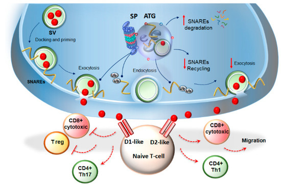 Autophagy and proteasome modulate immune activity by surveilling dopamine (DA) release. The standard proteasome (SP) and autophagy blunt DA release by degrading entire synaptic vesicles (SVs), as well as soluble Nsf attachment protein receptor (SNARE)- and SNARE associated-proteins, which foster synaptic vesicle exocytosis. In fact, they both prevent the rapid recycling of SV proteins back to the plasma membrane, which would otherwise lead to a further round of exocytosis. In this way, SP- and autophagy-dependent amount and duration of DA released at the level of the neuro-immunological synapse surveils the stimulation of DA receptors expressed on T-cells. This is seminal to modulate the differentiation of T-cells toward cytotoxic-, regulatory-, or helper-T-cells, as well as T-cell migration in periphery. For instance, the abnormal stimulation of D1-like receptors increases cyclic adenosine monophosphate (cAMP) levels to inhibit cytotoxic CD8+ cells; it impairs the differentiation and activity of T-regulatory cells, while inducing polarization of naive CD4+ cells toward the Th17 phenotype. On the other hand, the stimulation of D2-like receptors induces the differentiation of CD8+ cells into cytotoxic T-lymphocytes, induces the polarization of naive CD4+ cells toward the Th1 phenotype, and controls T-cell migration and adhesion. Dotted blue arrows indicate the progression of the SV cycle. Solid blue arrows indicate the targeting and shuttling of SNARE proteins to the UPS and autophagy. Solid red arrows indicate the increase/decrease in SNAREs degradation/recycling and exocytosis rate. Dotted red lines indicate the induction (arrows) or inhibition (lines) of naïve T-cells differentiation towards various phenotypes following abnormal stimulation of DA receptors.