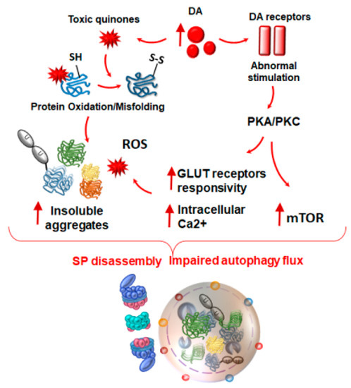 The effects of abnormal DA release and stimulation of DA receptors on proteasome and autophagy. An abnormal amount of intracellular DA may foster the loss of compartmentalized physiological oxidative deamination of DA, which readily undergoes auto-oxidation to produce toxic quinones and highly reactive chemical species such as reactive oxygen species (ROS). In turn, these react with sulfhydryl groups and promote the structural modifications of proteins, lipids, and nucleic acids within the DA axon terminals and surrounding compartments. Structural modifications of proteins translate into the formation of insoluble aggregates overwhelming both the SP and autophagy degradative potential. At the same, the abnormal release of DA produces an abnormal stimulation of post-synaptic DA receptors, which are coupled with intracellular cascades such as protein kinase A and C (PKA/PKC). The non-canonical activation of these cascades promotes the hyper-phosphorylation and activation of glutamate (GLUT) receptors and ion channels, which foster GLUT hyper-responsivity and Ca2+ uptake converging in the increase of oxidative stress. Again, the intracellular cascades placed downstream of the DA receptors (mostly D1-like) converge on activating the mammalian target of rapamycin (mTOR) pathway, thus promoting SP and autophagy downregulation. Red arrows in bold indicate increased levels. Plain red arrows indicate the formation of DA-derived toxic quinones and oxidized/misfolded proteins up to insoluble aggregates, and the progression of the various metabolic cascades that arise from abnormal stimulation of DA receptors.