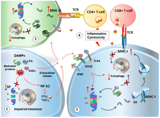 As a consequence of the autophagy and SP dysregulation, indigested misfolded or oxidized substrates may perpetuate inflammation through the release of danger-associated molecular pattern molecules (DAMPs) (Figure 4). In fact, DAMPs activate NF-κB and the inflammasome to release cytokines such as IFNγ, along with spreading misfolded proteins, advanced glycation end-products (AGEs) and free radicals, which all converge to induce the upregulation of IP within neighboring cells via autocrine or paracrine mechanisms. DAMPs may also stimulate toll-like 4 receptor (TLR4) to impair both SP and autophagy [75]. In this scenario, impaired SP and autophagy can neither digest potentially harmful DAMPs, nor restrain the release of DA and GLUT, which may add on glia activation and the release of pro-inflammatory signals recruiting T-cells within the CNS. In this way, IP upregulation leads to an overproduction of neuronal and glial antigens co-expressed with MHC-I molecules to prime cytotoxic CD8+ T cell response (Figure 4). At the same time, autophagy cannot efficiently provide for the internalization of MHC-I molecules or the degradation of damaged proteins and organelles, which fuels inflammation and immune activation. Thus, alterations of autophagy and UPS may explain why a variety of CNS disorders feature concomitant alterations in neurotransmitter activity, oxidative-inflammatory stress, and inappropriate immune response, which synergize to alter synaptic plasticity and damage neurons.