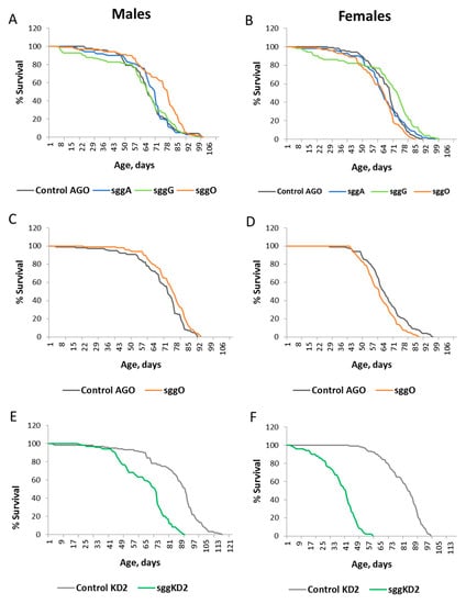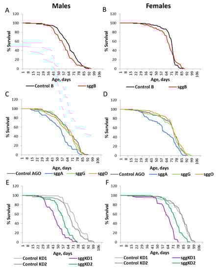 Effects of disordered sgg expression in muscles on male (A,C,E) and female (B,D,F) lifespans. Control B, sggB, Control AGO, sggA, sggG, sggO, Control KD1, sggKD1, Control KD2, and sggKD2 denote hybrid genotypes obtained as a result of crossing the corresponding lines with the driver line D3 inducing the expression of transgenic constructs in muscles. A full description of the genotypes is given in the Materials and Methods section.