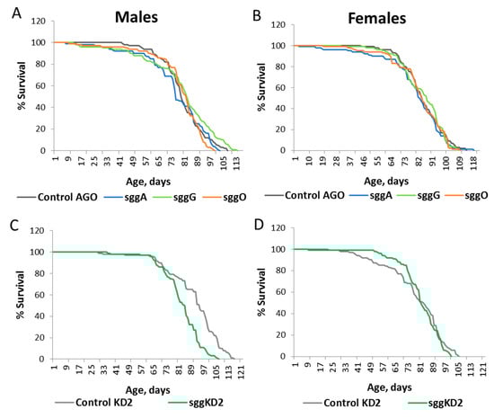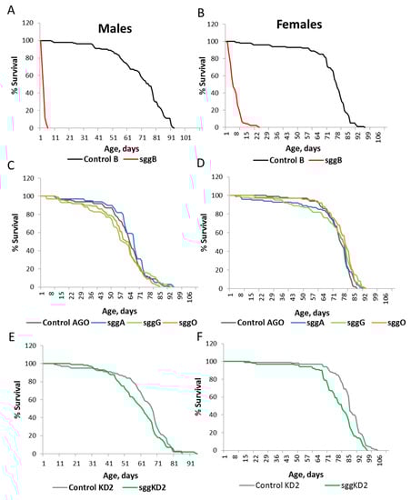 Overexpression of sgg-RB in embryos was lethal, and overexpression of sgg-RA and sgg-RG had no effect on the lifespan of both males and females (Table S1, Figure 1A,B). Overexpression of sgg-RO affected male and female lifespans in opposite directions: In males, lifespan was significantly increased, while in females, lifespan was decreased (Table S1, Figure 1A,B). In the second experiment aimed to verify this result, the effects were reproduced, although the level of the effects was somewhat lower in both males and females (Table S1, Figure 1C,D). As expected, the effect of the overall sgg knockdown was lethal when the stronger sggKD1 line was used, while the weaker knockdown decreased the lifespans of both males and females (Table S1, Figure 1E,F).