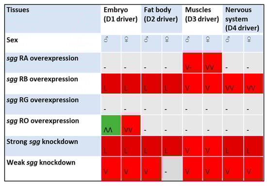 Effects of disordered sgg expression in different tissues on male and female lifespans. Dark-red cells, L: lethal effects; red cells, V: lifespan significantly decreased; gray cells, -: no effect; green cells, Λ: lifespan significantly increased. The number of V or Λ characters in a cell denotes the number of independent experiments.