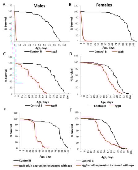 Severe effects of sgg-RB overexpression in the nervous system on male and female lifespans were confirmed in the independent experiment, which was performed approximately a year after the first experiment (Table S4, Figure 6A,B). In both replicate experiments, the effects in males were more pronounced (Figure 4A,B and Figure 6A,B); however, flies of both sexes lived only several days.