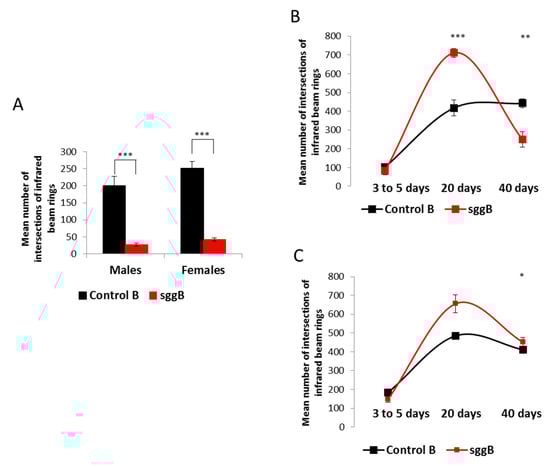 First, we demonstrated that locomotion was highly impaired in 3- to 5-day-old males and females with panneuronal overexpression of sgg-RB (Figure 7A), indicating severe lesions in the functional status of the nervous system. These flies did not live longer than 10 days (males) or 15 days (females), and most of them hardly moved at all in the second half of life, so we were not able to characterize the age-dependent dynamics of their locomotion. In 3- to 5-day-old males and females with sgg-RB overexpression in motor neurons, locomotion was not changed compared to that of control flies, and in 20-day-old flies, locomotion was significantly increased compared to that of control flies (Figure 7B,C). In 40-day-old control flies, locomotion was still high, while in flies with sgg-RB overexpression in motor neurons, a substantial decline in locomotion was observed (Figure 7B,C). Of note, the mean lifespan of control males and females was 64 ± 3 and 68 ± 2 days, respectively (Table S4), and at the age of 40 days, the flies were not truly aging. The mean lifespan of males with sgg-RB overexpression in motor neurons was 35 ± 2 days (Table S4), and 40-day-old males were intensively aging, which was reflected in the rapid decline in locomotion that decreased below the control level. The mean lifespan of females with sgg-RB overexpression in motor neurons was 58 ± 2 days (Table S4), and the biological age of 40-day-old females was younger than in males, which was reflected in a smaller decline in locomotion that stayed at the control level. Overall, in our experiments, locomotion, as reported by [], appeared to be a good marker of aging.