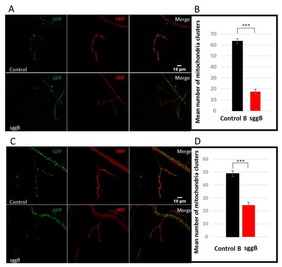 Mitochondrial clusters in NMJs of third-instar female larvae with panneuronal sgg-RB overexpression (A,B) and sgg-RB overexpression in motor neurons (C,D). Control B, sggB denote hybrid genotypes obtained as a result of crossing the corresponding lines with the driver line D4 inducing the expression of transgenic constructs in the nervous system or the driver line D12 inducing the expression of transgenic constructs in motor neurons. A full description of genotypes is given in the Materials and Methods section. Representative confocal images of NMJs (muscle 4, hemi-segment 34–) stained for mitochondria clusters (GFP, green) and neural membranes (HRP, horseradish peroxidase, red) (A,C). Bar = 10 µm. Quantification of the number of mitochondrial clusters (B,D). *** denotes p < 0.001 determined by the Kruskal-Wallis test.