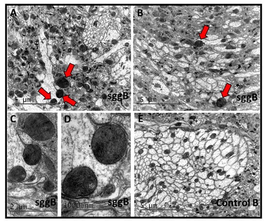 Fine structure of the adult brain in females with pan-neuronal sgg-RB overexpression. Control B, sggB denote hybrid genotypes obtained as a result of crossing the corresponding lines with the driver line D4 inducing the expression of transgenic constructs in the nervous system. A full description of genotypes is given in the Materials and Methods section. Three representative transmission electron microscopy images of the Drosophila inferior dorsofrontal protocerebrum at the age of 3 days (A,B,E); enlarged fragments of panel B (C,D). Mitochondria with violated structures are indicated by red arrows. Bar = 5 µm or 2 µm.