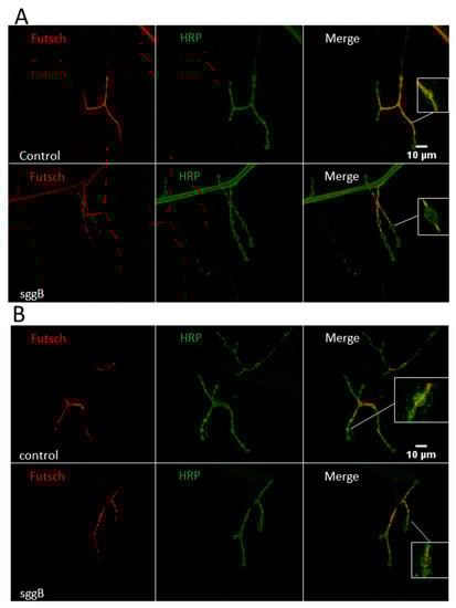 Not only mitochondrial movement, but also the overall functionality and architecture of neurons depend on the integrity of their cytoskeletons. We assessed the effects of sgg-RB overexpression in individuals with pan-neuronal sgg-RB overexpression and sgg-RB overexpression in motor neurons on the morphology of the microtubule network in NMJs, as visualized by antibodies to α-acetylated tubulin and to Futsch, a neuronal microtubule-associated protein []. Staining with antibodies to α-acetylated tubulin failed to reveal visual differences between the individuals with and without sgg-RB overexpression (Figure S3). Differences in the distribution of Futsch within the NMJs were found. In particular, in individuals with sgg-RB overexpression, only weak, diffuse Futsch staining in synaptic boutons of NMJs was observed compared to that in controls (Figure 10), indicating cytoskeletal abnormalities. In this case, the effect was more pronounced in individuals with pan-neuronal sgg-RB overexpression (Figure 10A) than in individuals with sgg-RB overexpression in motor neurons (Figure 10B), which correlates with the comparative effect on lifespan. It was shown that sgg interacts with Futsch, which functions downstream of sgg []; most likely, sgg controls synaptic growth through the direct phosphorylation of Futsch. Sgg is able to inhibit transcription factor AP-1 and the JNK (Jun-N-terminal kinase) cascade and, in this way, also affects synaptic growth []. Our data shed light on the cellular consequences of presumed increased phosphorylation of Futsch, which disappeared from synaptic boutons of NMJs, and demonstrated that Sgg-RB, when overexpressed, controlled the dynamics of the microtubule cytoskeleton.