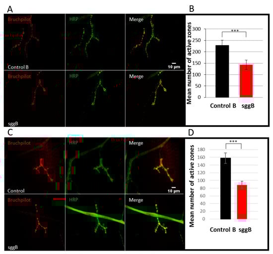 Given that the number and size of synapses were shown to be affected by sgg function [,], we decided to evaluate the number of active synaptic zones in individuals with sgg-RB overexpression. The number of active zones in larval NMJs visualized by antibodies to BRP (Bruchpilot), a Drosophila homolog of vertebrate active zone protein ELKS [], was significantly (approximately two-fold) decreased in individuals with pan-neuronal sgg-RB overexpression (Figure 11A,B) and sgg-RB overexpression in motor neurons (Figure 11C,D), indicating reduced synaptic activity. sgg-RB overexpression driven by both drivers had comparable effects on NMJs. These results supplemented the data on the role of Sgg in controlling the functionality of synapses, which demonstrated that it was involved in the regulation of neurotransmitter release []. Earlier, it was shown that the number of boutons was significantly decreased as a result of pan-neuronal GSK3 overexpression []. Importantly, although sgg overexpression has an inhibitory role on the quantity of boutons, it may not play an important role in bouton differentiation []. Overall, our data demonstrated that negative changes in lifespan caused by Sgg-RB overexpression in the nervous system were accompanied by negative changes in synaptic properties.