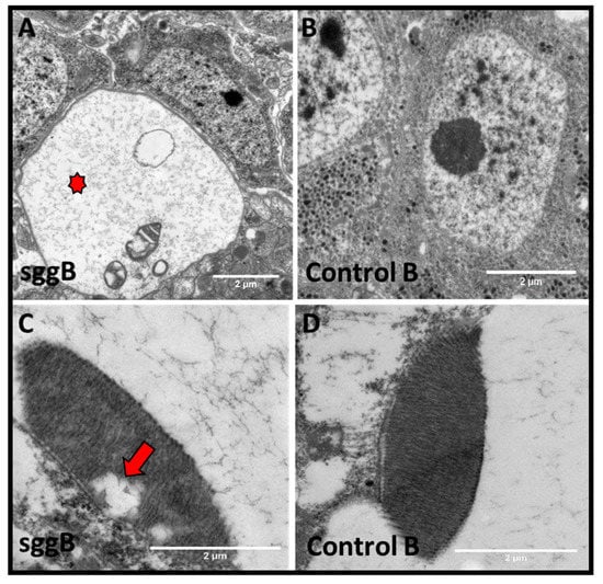 Signs of degeneration in the nervous system of females with pan-neuronal sgg-RB overexpression. Control B, sggB denote hybrid genotypes obtained as a result of crossing the corresponding lines with the driver line D4 inducing the expression of transgenic constructs in the nervous system. A full description of genotypes is given in the Materials and Methods section. Representative transmission electron microscopy images of the Drosophila brain (A,B) and rhabdomeres (C,D) at the age of 3 days. An example of a degeneration sign in the neuron body (A, indicated by the red star); rhabdomeres with violated structure (C, lacuna is indicated by the red arrow) compared to the respective controls (B,D). Bar = 1 µm or 2 µm.