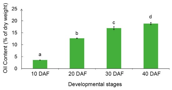 Total oil content in developing soybean seeds of NN1138-2 at 10, 20, 30, and 40 days after flowering (DAF). Different letters above the bars represent significant differences at 0.05 level by Fisher’s least significant difference (LSD) test. Error bars represent the standard deviation (SD) of means across three replications.