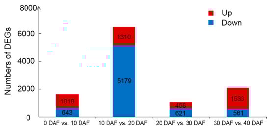 Numbers of differently expressed genes (DEGs) in comparison with the soybean developing seeds between adjacent developmental stages. DEGs were determined using the thresholds of FDR ≤ 0.05 and log2|Fold change| ≥ 1. The log2|Fold change| value of the pairwise comparison “a DAF vs. b DAF” was calculated by the formula: log2|Fold change| = log2(FPKM_b DAF)-log2(FPKM_a DAF).