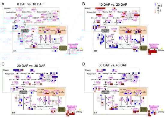 Mapman visualization of differentially expressed genes in the lipid metabolic pathways between the adjacent developmental stages in soybean seeds. (A) 0 DAF vs. 10 DAF. (B) 10 DAF vs. 20 DAF. (C) 20 DAF vs. 30 DAF. (D) 30 DAF vs. 40 DAF. Every square represents a gene. The color represents the log2|Fold change| of the gene with down-regulation in blue while up-regulation in red. The dotted boxes represent plastid and endoplasmic reticulum (ER), respectively. ACCase: acetyl CoA carboxylase. CPT: cholinephosphotransferase. DGAT: diacylglycerol: acyltransferase. EAR: enoyl-ACP reductase. FAD2: Fatty desaturase 2. FAD3: Fatty desaturase 3. FATA: fatty acyl-ACP thioesterase A. FATB: fatty acyl-ACP thioesterase B. GPAT: glycerol-3-phosphate acyltransferase. HAD: hydroxyacyl-ACP dehydrase. KAR: ketoacyl-ACP reductase. KAS I: ketoacyl-ACP synthase I. KAS II: ketoacyl-ACP synthase II. KAS III: ketoacyl-ACP synthase III. LACS: long chain acyl-CoA synthetase. LPAAT: lysophosphatidic acid-acyltransferase. LPCAT: lysophosphatidylcholine acyltransferase. MCMT: malonyl-CoA: ACP malonyltransferase. PAP: phosphatidic acid phosphatase. PDAT: phospholipid: diacylglycerol acyltransferase. PDCT: phosphatidylcholine: diacylglycerol choline phosphotransferase. PLD: phospholipase D. SAD: stearoyl-ACP desaturase.