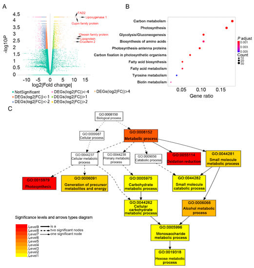 Functional analysis of DEGs comparing 20 DAF with 10 DAF in developing soybean seeds. (A) Volcano plot of differentially expressed genes. The x-axis shows log2|Fold change| in expression and the y-axis represents the minus log10 (p value) of a gene being differentially expressed. log2|Fold change| = log2 (FPKM_20 DAF)- log2(FPKM_10 DAF). Genes related to lipid metabolism or lipid storage in the top 10 up-regulated DEGs at 20 DAF vs. 10 DAF are marked by red points and black arrows. (B) Top 10 enriched KEGG pathways of up-regulated genes comparing 20 DAF with 10 DAF (p < 0.01). The colors of dots represent the p values relative to the other displayed pathways and the dot size represents the number of genes in the pathway. The x-axis shows gene ratio and y-axis shows the pathway. Gene ratio is the ratio of up-regulated gene number (comparing 20 DAF with 10 DAF) to the soybean genome-wide number in a certain pathway. (C) Gene ontologies (GO) enrichment analysis (in biological process) of up-regulated genes comparing 20 DAF with 10 DAF (FDR < 0.01). The numbers and names of GO terms are shown in boxes. Box colors indicate levels of statistical significance: Level 1 p = 0.05, Level 2 p = 5 × 10−3, Level 3 p = 5 × 10−4, Level 4 p = 5 × 10−5, Level 5 p = 5 × 10−6, Level 6 p = 5 × 10−7, Level 7 p = 5 × 10−8, Level 8 p = 5 × 10−9, Level 9 p = 5 × 10−10. Solid, dashed, and dotted lines represent two, one and zero enriched terms at both ends connected by the line, respectively.
