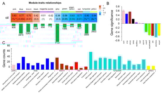 Correlation between gene co-expression network and oil content in developing soybean seeds. (A) The correlations between gene co-expression modules and oil content. The first colored row represents the modules detected by Weighted Correlation Network Analysis (WGCNA), and the colored cells below represent their correlations with oil content. The corresponding correlation coefficient (top) and p value (bottom) are displayed in each cell. The cells are color-coded by the correlation coefficient (r) as shown by the color key on the right. Red represents positive correlation while blue represents negative correlation. The green bar below each module represents the number of genes in each module. (B) Bar plot represents the average gene significance for each detected module. (C) Enriched pathways in genes of pink, blue, brown, red, turquoise and yellow modules, respectively. The x-axis shows the names of the pathways, and the y-axis displays the gene numbers in each pathway.