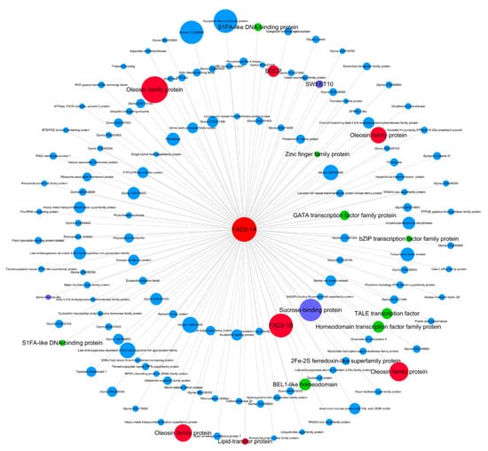 Hub genes are often considered as important factors in gene co-expression networks. Here we identified the top 10 hub genes in each of the pink, blue, brown, yellow, turquoise and red modules (Table S3) according to module membership (MM) value, which is also known as kME (eigengene connectivity). Among these hub genes, FAD2-1A (Glyma.10G278000) responsible for converting C18:1 to C18:2 [32] is in the pink module with the highest MM value (Table S3). The visual co-expressed network of FAD2-1A (Glyma.10G278000) in the pink module was constructed (Figure 6). The FAD2-1A co-expressed genes include genes encoding four oleosins (Glyma.05G013800, Glyma.06G078700, Glyma.06G209900 and Glyma.17G122000), the FAD2-1B (Glyma.20G111000), a biotin carboxyl carrier protein (BCCP, Glyma.19G028800) and a lipid transfer protein (Glyma.16G100100), which are related to lipid metabolism. This co-expression network also contains genes encoding eight transcription factors (Glyma.01G179900, Glyma.03G179000, Glyma.05G209600, Glyma.11G062300, Glyma.17G132600, Glyma.19G179700, Glyma.U018600, and Glyma.06G047000), a sweet sucrose efflux transporter family protein (Glyma.06G167000), a sucrose binding protein (Glyma.02G145700) and an alpha-amylase (Glyma.14G222600), which are related to sucrose and starch metabolism.