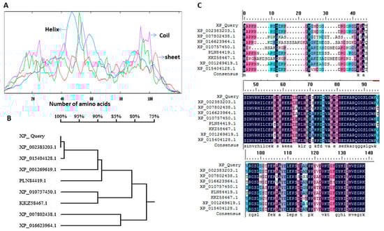 Sequence and phylogenetic analysis. (A) Distribution of secondary structure elements in ppci1. Red color shows sheet, purple for coil and blue for the helix. The x-axis shows the number of amino acids. (B) Phylogenetic analysis of the amino acid sequences of ppci1. Homologous protein sequence sources were obtained from NCBI the Basic Local Alignment Search Tool, and the numbers on the branches represent the bootstrap values for 1000 replicates. (C) Comparison of the amino acids of ppci1 from other known fungi. Identical residues are shown in black color.