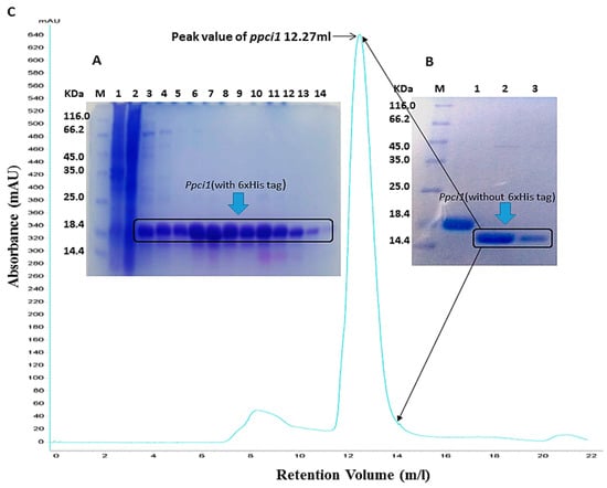 Mass spectrometry analysis of ppci1 was performed by Beijing Protein Innovation. The band containing ppci1 was excised from the SDS-PAGE (Sodium dodecyl sulfate polyacrylamide gel electrophoresis) then digested with a reagent containing 50% acetonitrile and 25 mM ammonium bicarbonate. Complete absorption of colloidal particles was carried out with 10 mM DTT (dithiothreitol) by incubating at 50 °C for 60 min. Furthermore, DTT was removed, and 55mM IAM (Iodine acetamide), was added then incubated at room temperature for 45 min. After the removal of excess IAM, the sample was washed with 25 mM ammonium bicarbonate for 10 min, twice. The enzyme was diluted with 25 mM ammonium hydrogen carbonate and added into the dehydrated colloidal particles for full absorption. Finally, digestion reaction was terminated with 0.1% concentrated FA (formic acid), and the sample was detected via Q-TOF (Quadrupole Time-of-Flight). Protein identification was performed with the Mascot search algorithms [].